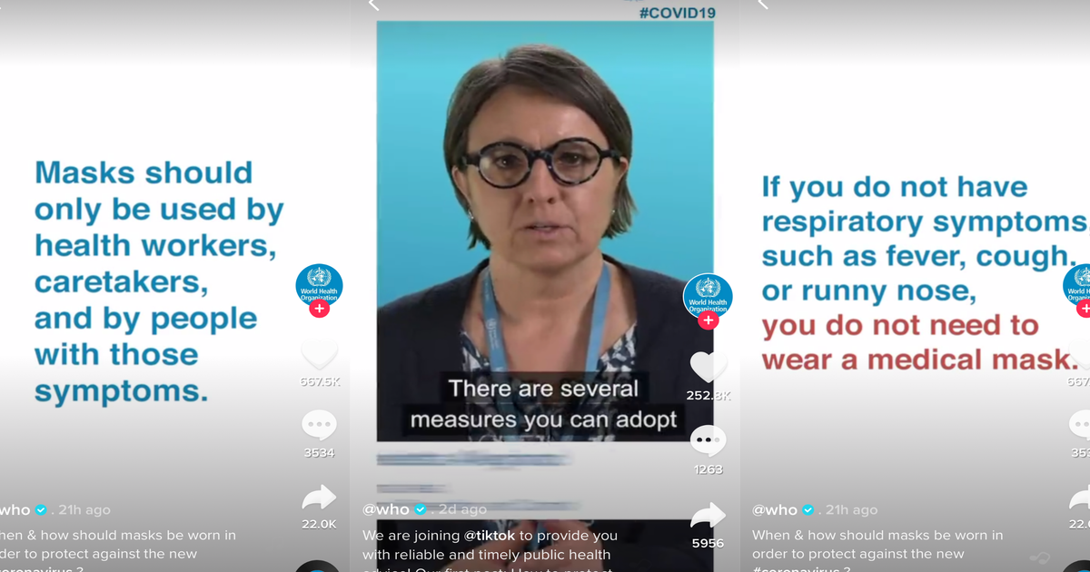 https://ocdn.eu/pulscms-transforms/1/VEDktktTURBXy9mMThjYmQ4YS00M2E1LTQxYTQtODMzMy0yMzI1NGU2MzcwOWQucG5nkZMFzQSwzQJ2 It has so far posted two videos: one offering COVID-19 prevention tips and another clarifying the use of face masks. The World Health Organization joined TikTok in an apparent effort to spread accurate information about COVID-19 to the app's userbase, as fears of a possible global pandemic rise. As the MIT Technology Review reportedContinue reading “The World Health Organization joined TikTok to post ‘reliable’ advice about the coronavirus amid a stream of memes and misinformation [ARTICLE]”